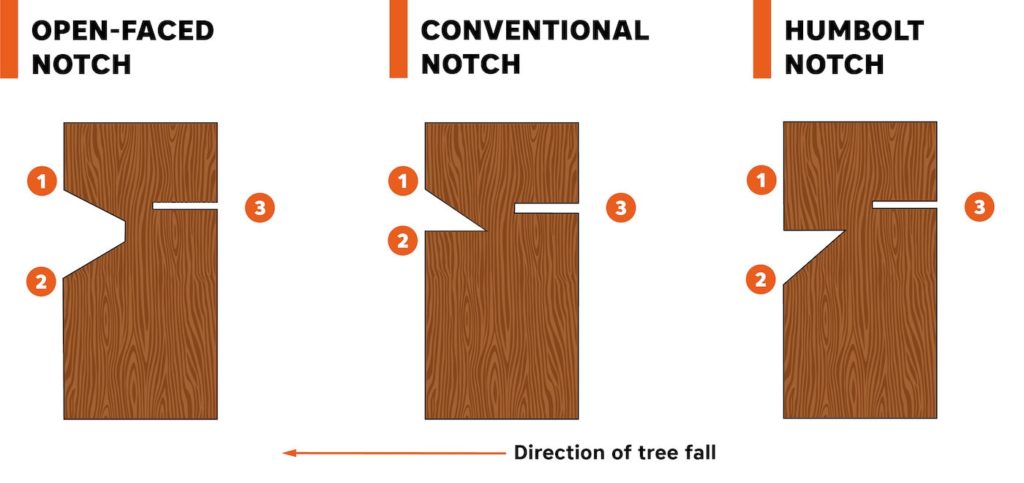 • The Humbolt notch is more dangerous than the open-face notch because it only guides the tree for the first half of the fall, after which it is in a free-fall state.