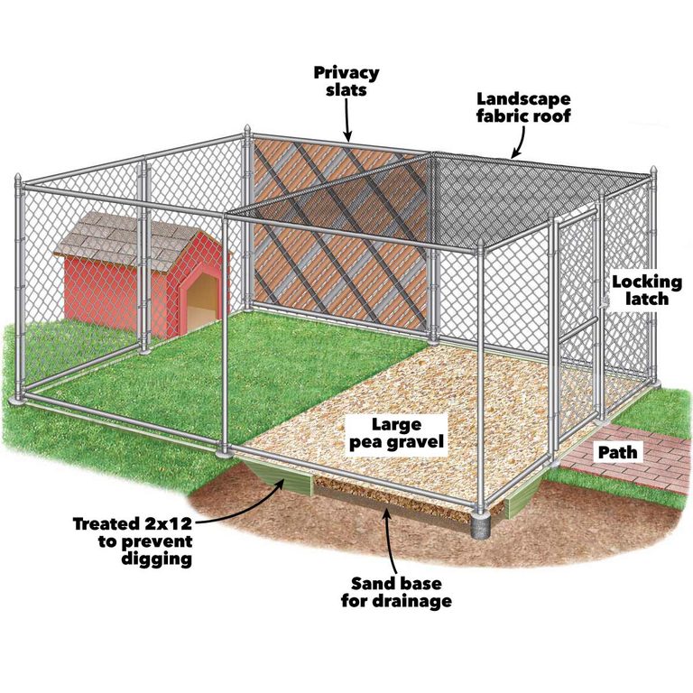 Materials: | Gloves, chain link fencing, and gate, concrete, landscape fabric, pea gravel, privacy slats, dog house, sand |