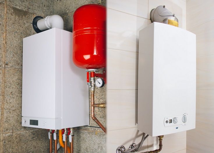 Boiler vs Water Heater. Left: Boiler (Source: nikkytok, Shutterstock), Right: Water Heater (Source: MStock00, Shutterstock)